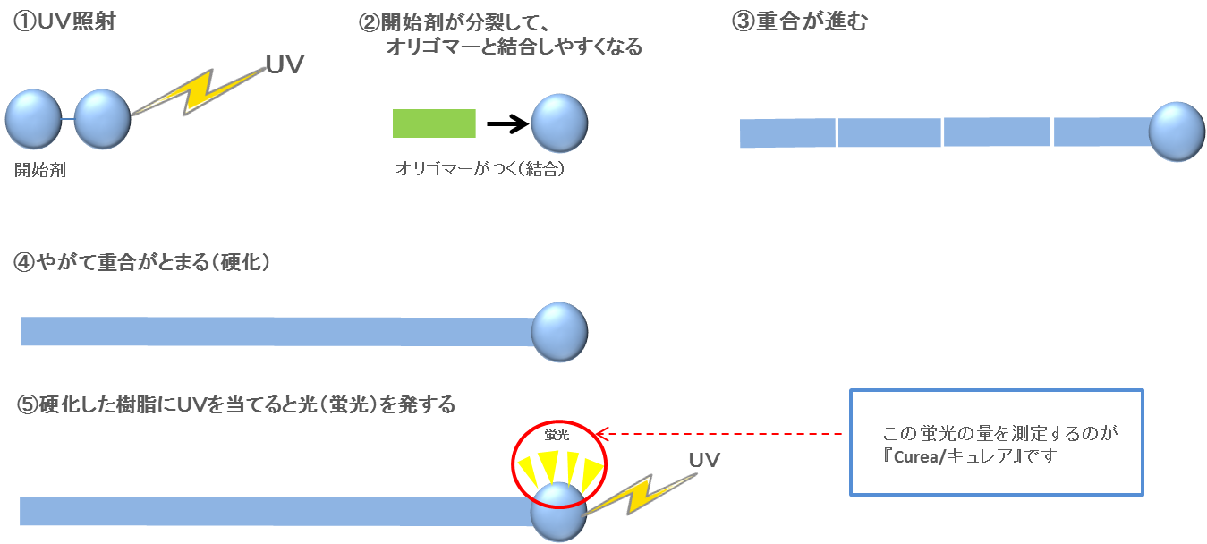 紫外線硬化樹脂では、多くの場合、硬化が進むに連れて蛍光が変化するため、硬化状況を測定することが出来ます。